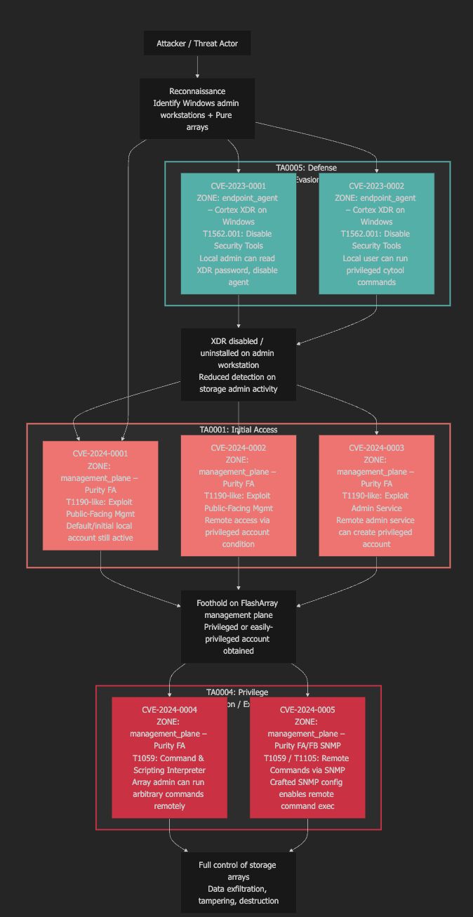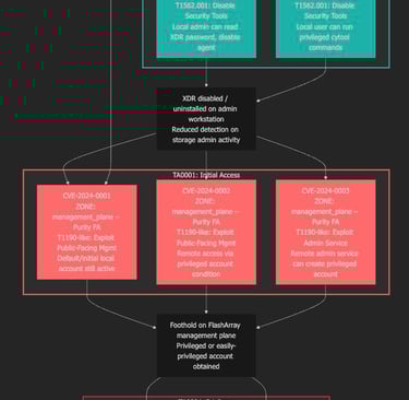 This attack path shows a modern sequence where the adversary first disables endpoint/XDR visibility (Defense Evasion), then uses exposed storage management-plane weaknesses for Initial Access, escalates privileges/executes remote commands, and ends with full control of FlashArray/FlashBlade—enabling exfiltration, encryption, or destruction. Vendor example is illustrative; the pattern is universal